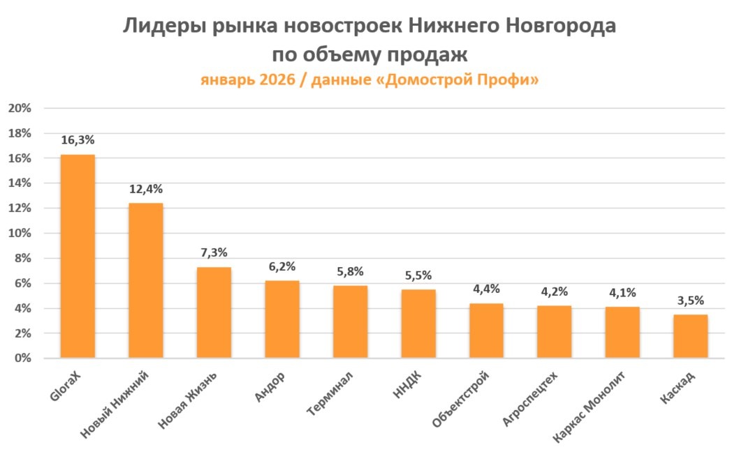 На первичном рынке жилья в Нижнем Новгороде по состоянию на начало 2026 года продолжают работать около 40 девелоперов, однако реальное влияние сосредоточено в руках нескольких крупных игроков. По словам разработчика аналитической системы «Домострой Профи» Сергея Филатова, различия в эффективности компаний становятся все заметнее: одни застройщики ускоряют продажи, а другие рискуют столкнуться с ростом остатков.