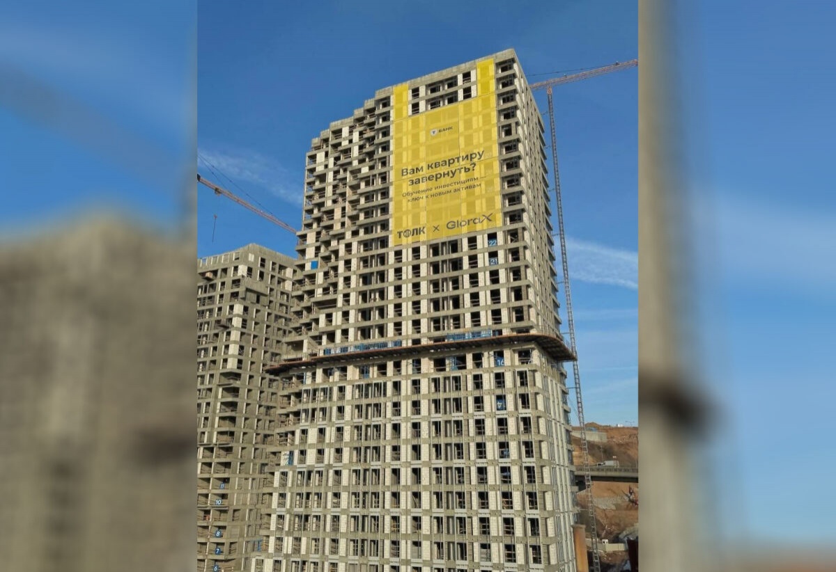 Как сообщили представители девелопера, инсталляция связана с партнерством GloraX и «Т-банком» в рамках форума «ТОЛК-2026». Креативный баннер служит анонсом: среди участников мероприятия будет разыграна квартира-студия в проекте компании в Новинках.