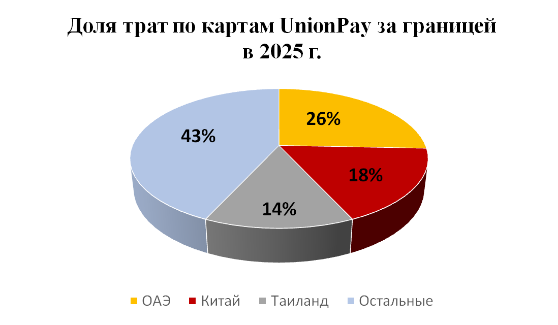Аналитики Россельхозбанка выделили три страны-лидера по общему объему трат по картам UnionPay за 2025 году за рубежом. Первую строчку занимают Объединенные Арабские Эмираты, что составляет 26% от общего объема трат (43%), на втором месте — Китай (18%) и на третьем — Таиланд (14%). На эти три государства приходится более половины всех зарубежных расходов россиян.