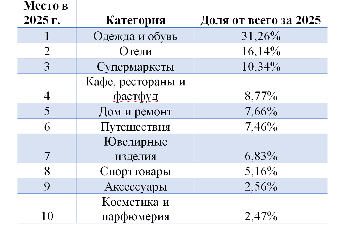 В поездках за границей россияне больше всего тратили на одежду и обувь (31,26% от общего объема трат за границей), отели (16,14%) и супермаркеты (10,34%). Первые две сохранили свои позиции второй год подряд, тогда как категория «Супермаркеты» поднялась на одну строчку вверх, заменив «Ювелирные изделия».